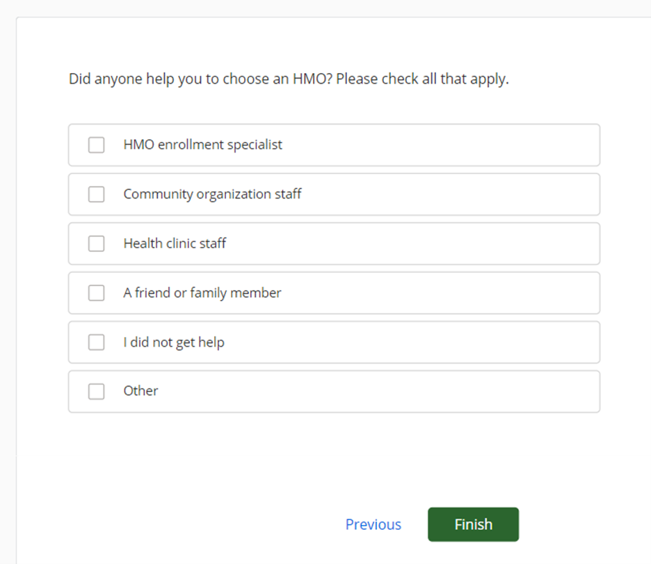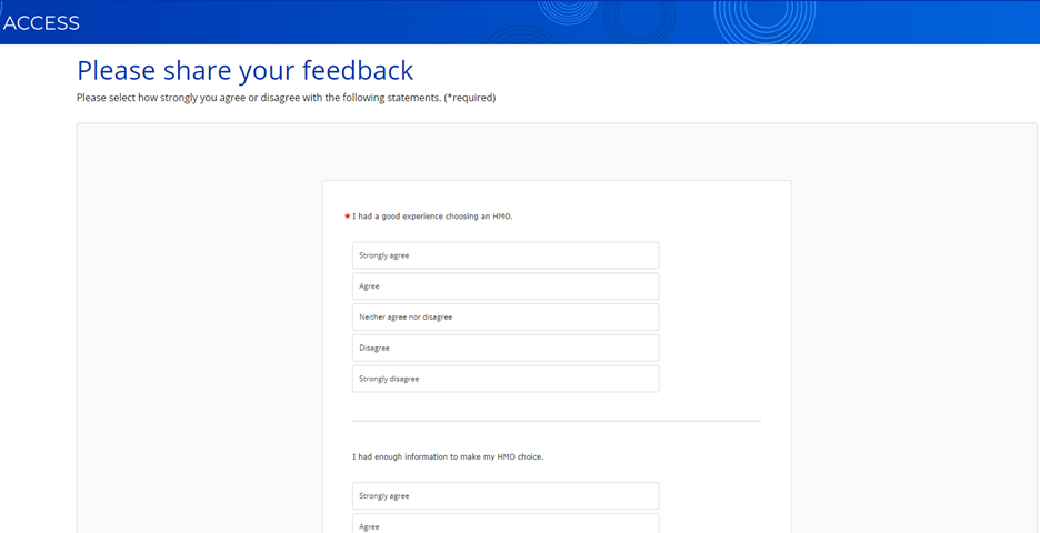 After choosing an HMO or enrolling in a new HMO, applicants and members have the option to take a survey about their experience using ACCESS to choose an HMO.