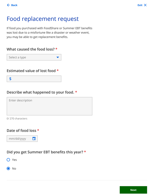 The following page displays to begin the request for food benefits replacement. This page allows members to request food benefits replacement when they experience a loss of food purchased with FoodShare or Summer EBT benefits due to household misfortune or natural disaster.