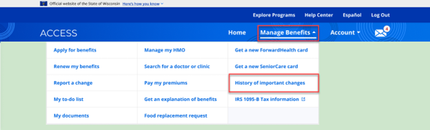 From the account homepage, select History of important changes under Manage Benefits.