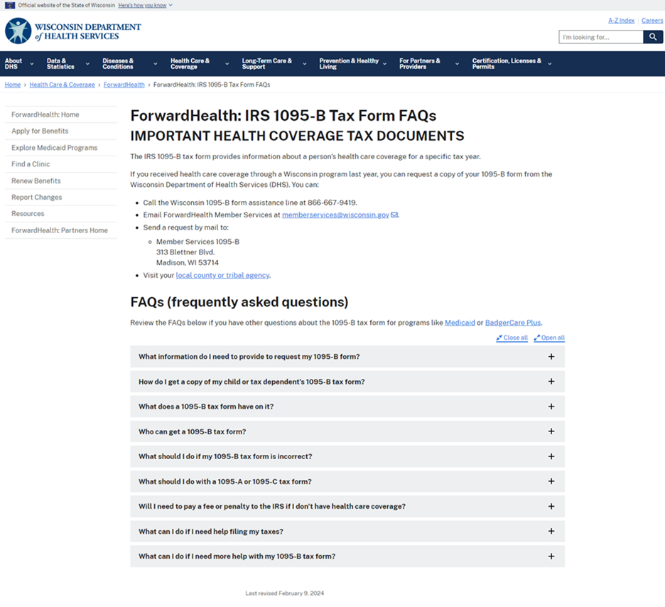 To get more information on how to request a 1095-B tax form select IRS 1095-B Tax information under Manage Benefits on the account homepage to be taken to the ForwardHealth: IRS 1095-B Tax Form FAQs Important Health Coverage Tax Documents page of the DHS website.