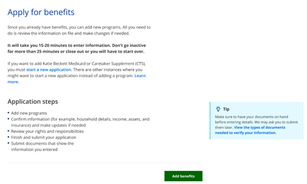 This page allows members to apply for another benefit while their case is open. Members can only apply for benefits they are not currently receiving. Members who have questions about their benefits should call their agency.