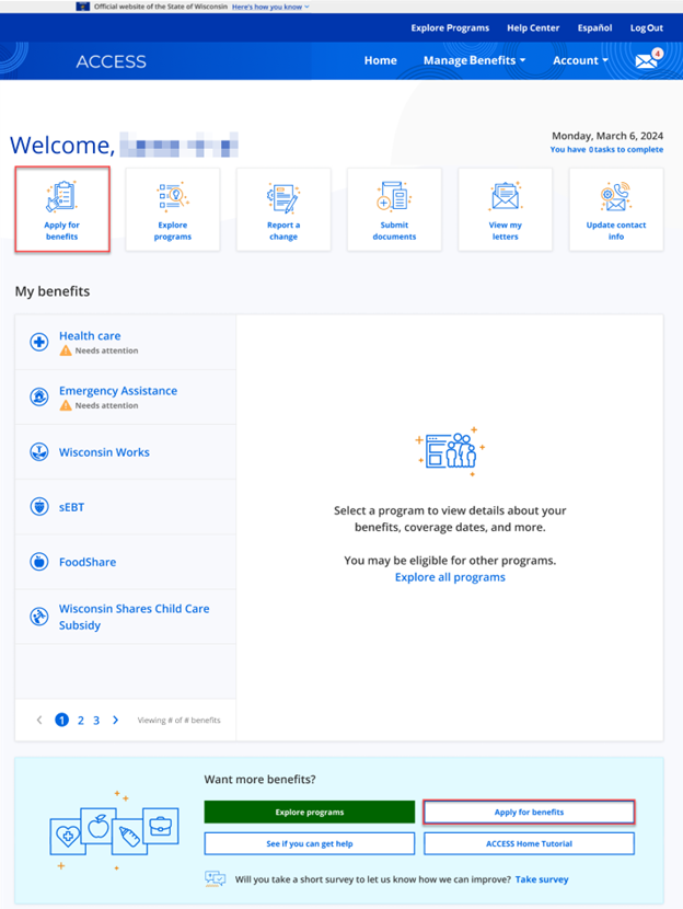 To apply for another program, select Apply for benefits under Manage Benefits on the account homepage. From the account homepage, the member can also select either Apply for benefits quick link at the top or bottom of the page.