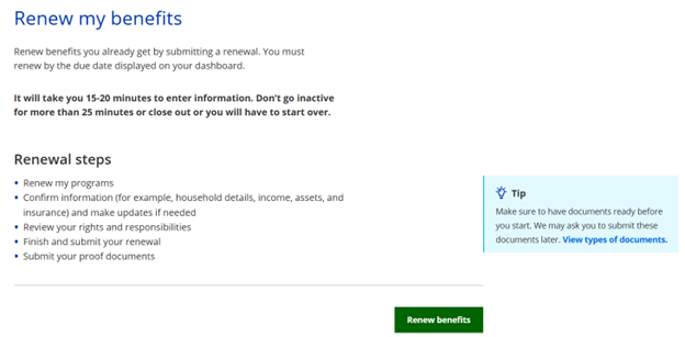 To start a renewal, select Renew my benefits under Manage benefits on the account home page.