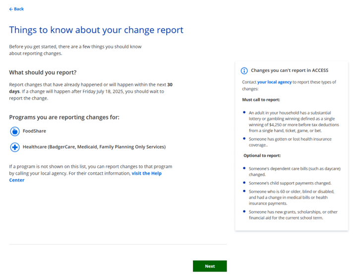 | Note | ACCESS can be used to report changes for FoodShare, health care, and Child Care, but not W-2. Changes that could affect W-2 eligibility must be reported to a member’s W-2 agency within 10 days of the change. |