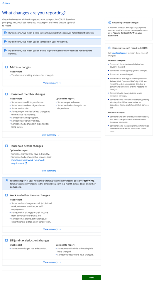 What changes are you reporting page displays. The changes that members must report differ based on the programs that they are enrolled in. Members may check the boxes for any changes they need to report. Some changes can’t be reported through ACCESS. For those changes, members must call their agency to report the change.