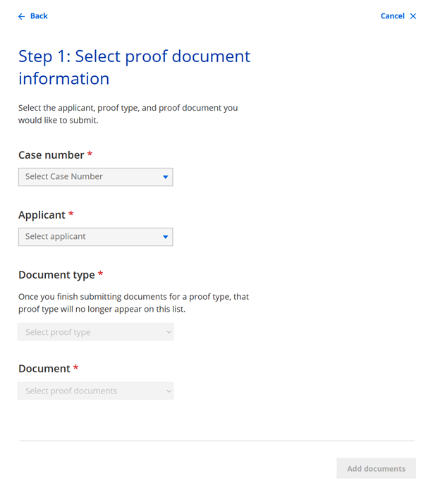 The member can select submit documents even if they are not required to submit needed or suggested documents. The following page displays to begin document submission.