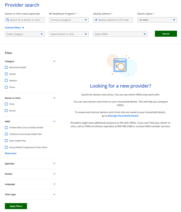 Select Search for a doctor or clinic under Manage Benefits on the account homepage. The Provider search page displays. From here, the member can search for doctors or clinics using various filter options, such as category, doctor or clinic name, HMO, specialty, gender, languages, and clinic type.