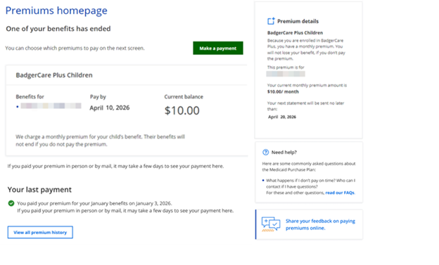 This option displays for members who owe a premium. Members can select Pay my premiums under Manage Benefits on the account homepage to see how much they owe, to make a payment, and to view all premium history. See CHAPTER 11 PREMIUMS for more information.