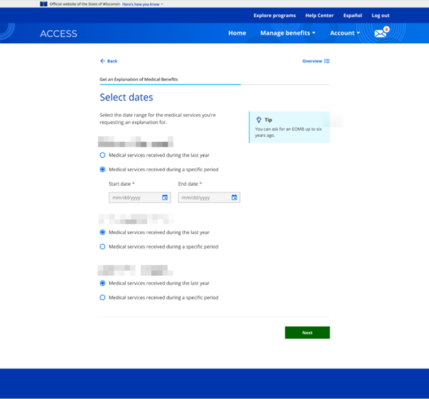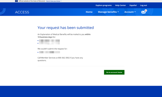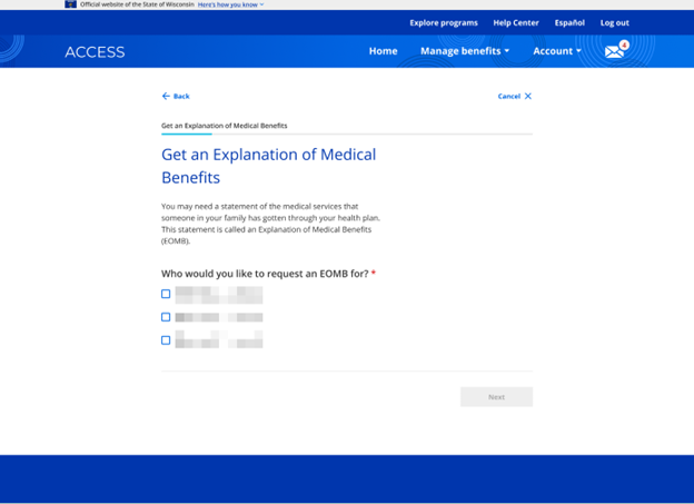 An Explanation of Medical Benefits (EOMB) is a statement of medical services that have been received through a health plan. Members can request an EOMB for up to the last six years through their ACCESS account. The primary person or the spouse of the primary person can request an EOMB for anyone receiving health care on their case. A person who is not the primary person or is not the spouse of the primary person can only request an EOMB for themselves.