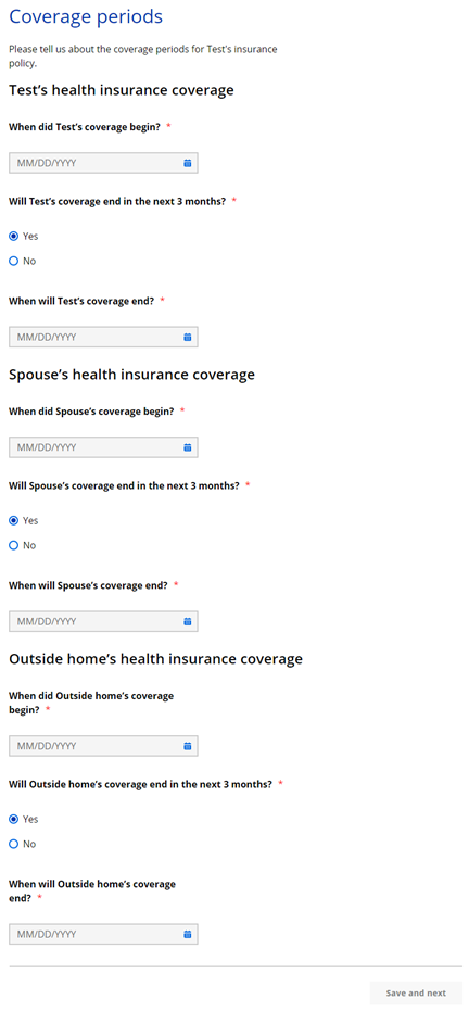 The Coverage periods page asks about the coverage start date for the health care policy.