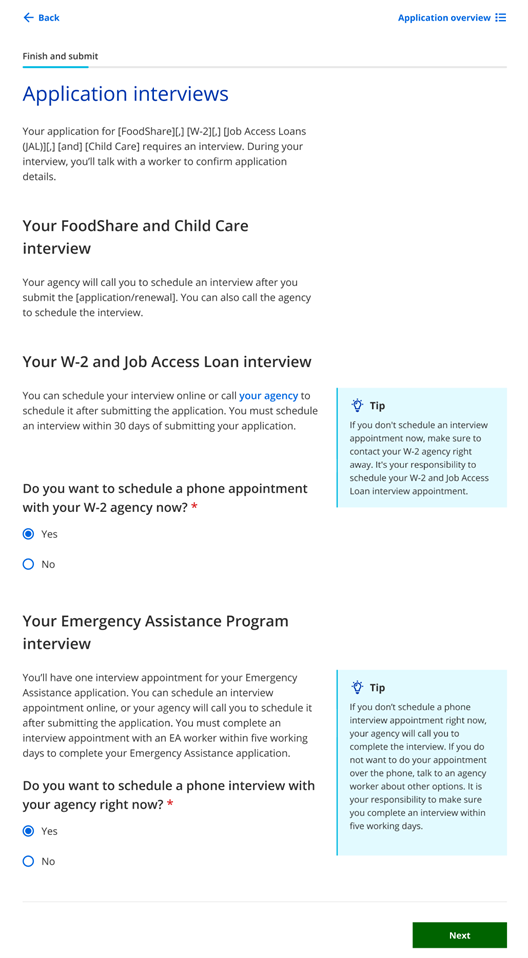 | Do you want to schedule a phone appointment with your W-2 agency now? | Select Yes or No. |