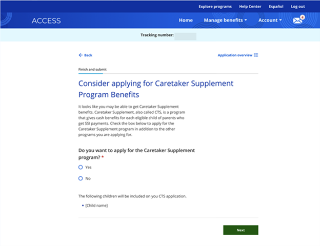 Once an applicant confirms their information, potentially eligible applicants have the opportunity to add Caretaker Supplement (CTS) to their benefit application. If the applicant selects Yes, all children included display in the CTS application. IM agencies determine eligibility based on eligibility rules.