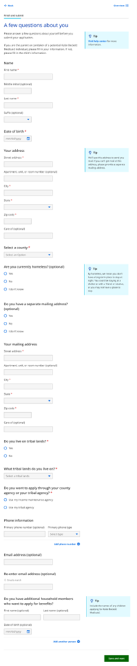 The A few questions about you page displays if the applicant opens the Finish and Submit section before completing the other sections. For Katie Beckett Medicaid-only applications, if a parent is applying for their child, they must enter their own information rather than the child's.
