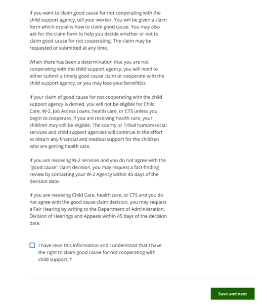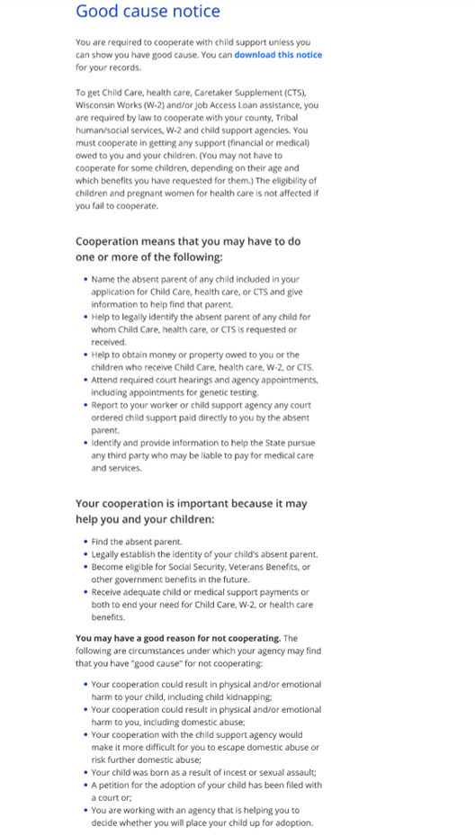 The Good Cause notice page asks the applicant if they have good cause to not work with the Child Support Agency to locate the absent parent. The applicant should claim good cause if cooperating with the Child Support Agency creates safety concerns for the applicant or their child.