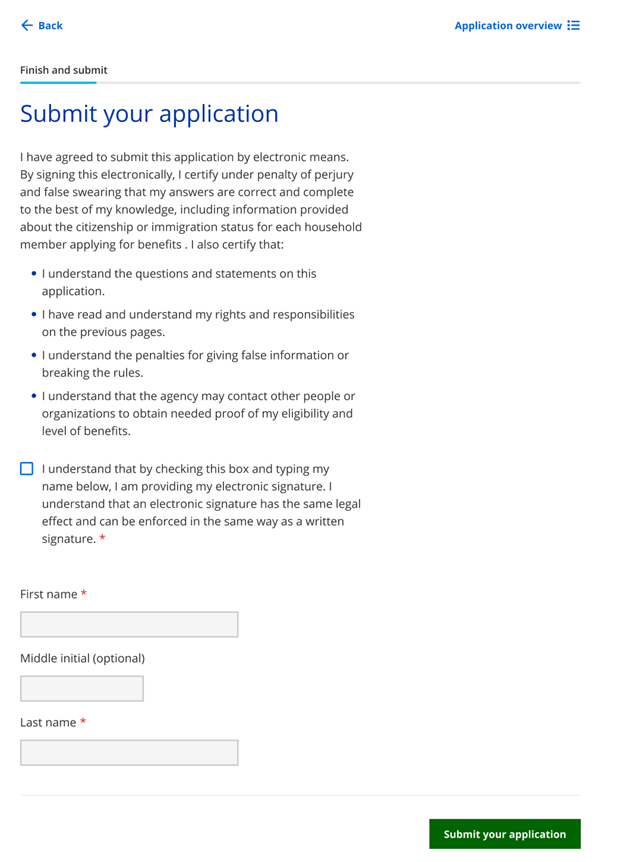 The final page asks the applicant to provide an electronic signature to submit their application. If the application includes a request for health care and a household member is potentially eligible for a long-term care program, this page includes a signature section for the applicant’s spouse if they are married. They must read the electronic signature acknowledgement and enter their name in the available field.