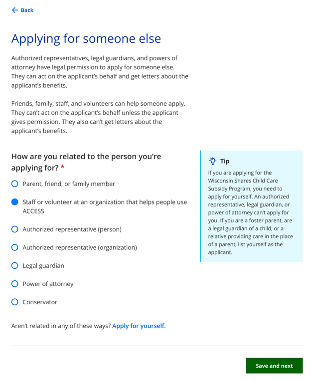 The Applying for someone else page asks the person how they are related to the primary applicant. Anyone can assist the applicant with applying but cannot act on the applicant’s behalf unless they have legal permission. An authorized representative, legal guardian, conservator, or agent with power of attorney can apply on behalf of the applicant for all programs except Wisconsin Shares Child Care Subsidy.