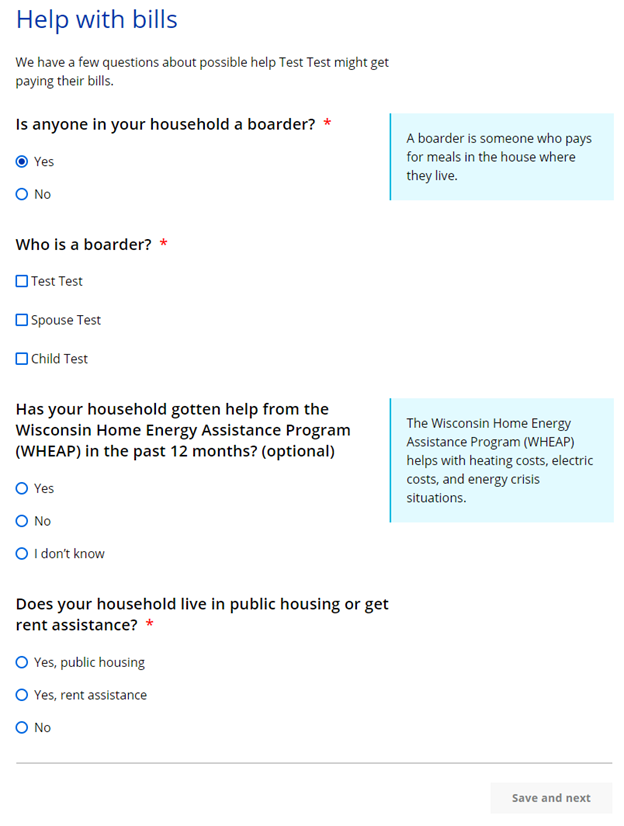 If more than one person in the household has housing or utility bills, the Your household’s housing and utility bills page displays. This page asks the applicant to select which member of the household’s housing and utility bills information to enter first. They return to this page after completing the housing or utility bills information for each person until all are done.