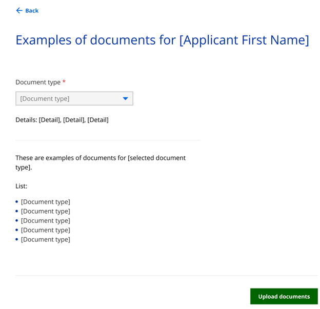 Depending on their application, the applicant or member may not have to upload any documents. To see examples of documents, select Examples of documents. This navigates the applicant or member to the Examples of documents for _____ page which provides examples of the required documents for that individual.
