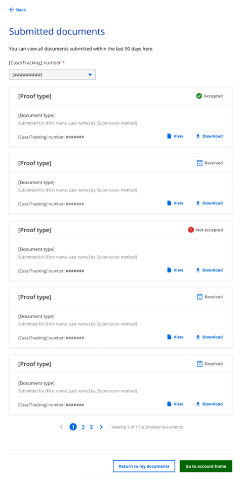 If the applicant or member has more than one application, only the [Case/Tracking] number drop-down shows by default. Once a case or tracking number is selected the associated proof type cards appear for that case or tracking number.