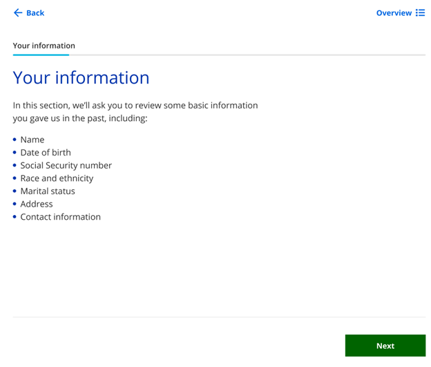The member reviews basic information that is currently on file with the agency, including: name, date of birth, SSN, race and ethnicity, marital status, address, and contact information. Select Next.