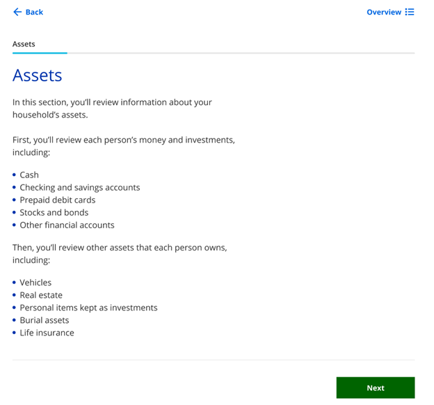 The member reviews information that is currently on file with the agency about the household’s assets. First review each member’s money and investments, then assets each member owns. If a new person joins the household, additional questions may be asked about that person. Select Next.