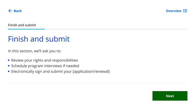 After the member completes the Your information section, the You finished the applicant information section page provides an opportunity for the member to review and edit their responses as needed. Once all updates and changes are complete, select Renewal overview.