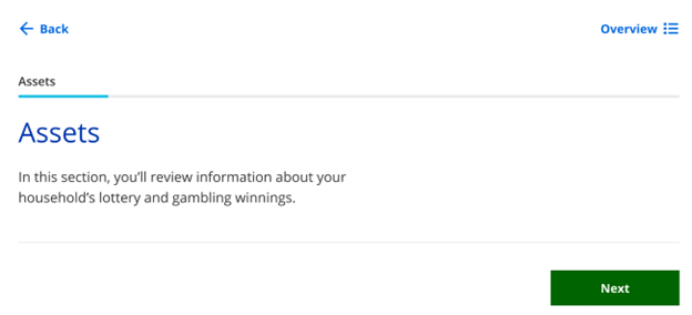 The member reviews information that is currently on file with the agency about the household’s lottery and gambling winnings. If a new person joins the household, additional questions may be asked about that person. Select Next.