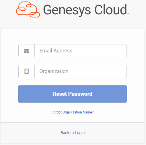 3. Enter the email address and click Reset Password. If prompted to enter the organization name, use dhsgenesysprod. If the email address is not recognized submit a Genesys support ticket. For more information, see Section 11.2.2 Opening a Ticket