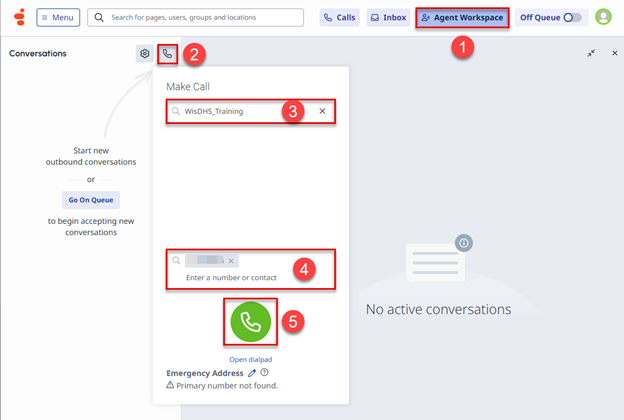 3. In the Make Call popup, select a queue. This causes the phone number associated with the queue to show in the external party’s caller ID. Additionally, this makes other Genesys call features available, such as scripts and Automated Telephonic Signature (ATS).