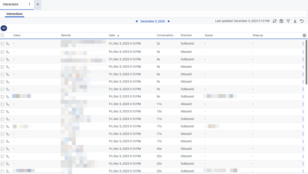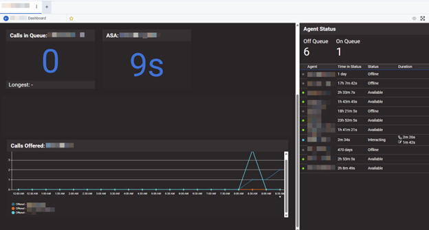 The following views display agent, queue, and call information.