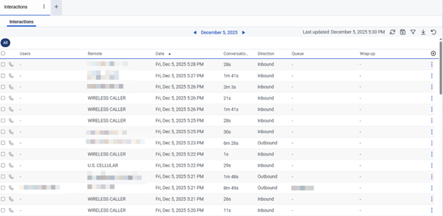 The default interactions view displays call history for the selected time period and live calls. The information displayed includes call participants, call date and time, duration, call direction, queue, and wrap-up code. Select an interaction for more information. Select a live call to monitor or coach. Select a completed call to access the call recording. For information about filtering, exporting, saving views, and downloading, see Section 6.1 Introduction to Performance. For information about monitoring and coaching, see section 6.9.1 Coaching and Monitoring Agents.