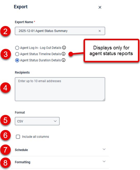 Supervisors can send reports to their Genesys inbox and any external email address as the immediate export of the current view or can schedule a single email or recurring future emails. Agent Performance, Agent Status, Queue Performance, and Interactions reports can be exported. Dashboards cannot be exported. By default, time values are displayed in milliseconds. See Section 6.8.1 Export a Report, Step 8, below, for time formatting.