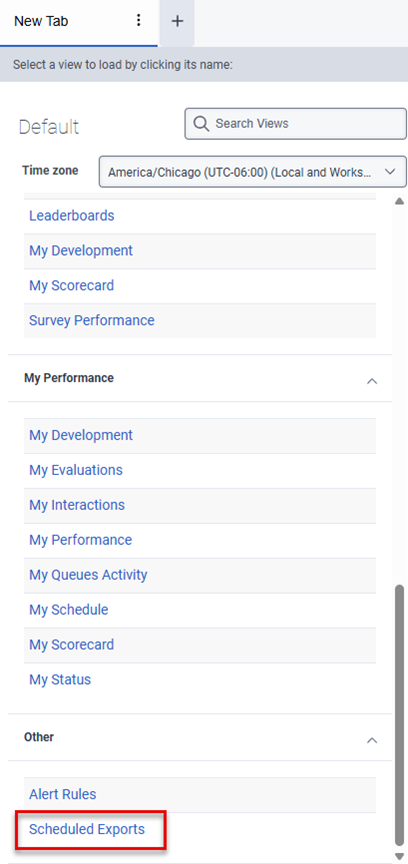 1. In the Analytics Workspace, from the New Tab, scroll down to the “Other” section and select Scheduled Exports.