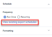 Note that Scheduled Exports view can be opened to enable/disable, run, edit, or delete existing schedules by clicking View existing export schedules in the Export pane or by opening a new tab and selecting the Scheduled Exports.