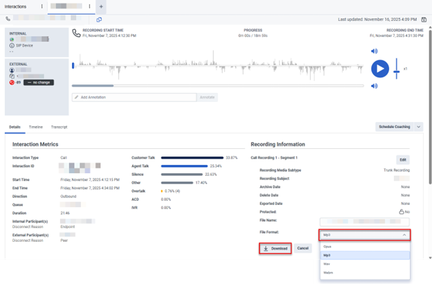 Calls can be downloaded to a computer. By default, files are saved to the downloads folder. Downloaded recordings are not saved to the Genesys inbox.