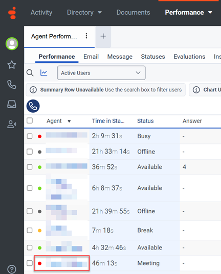 The Agent Status view allows supervisors to display status-related agent metrics. Select the help button in the bottom left corner of the window for help text specific to this view.