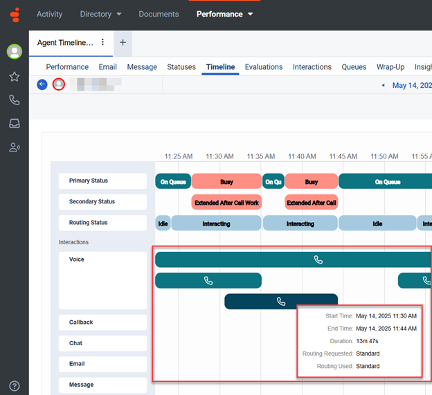 The Agent Timeline Detail view provides a visual representation of the conversations handled by the agents. This view enhances the supervisors’ visibility into agent activities, allowing them to observe how voice conversations are interwoven with multiple simultaneous digital interactions.