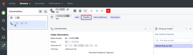 Click the transfer button to transfer the second party to the third party. After transferring the call, enter a wrap-up code (if the IM agency requires it), and click Done.