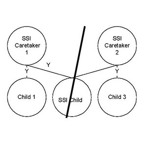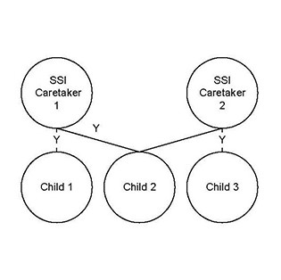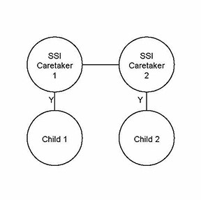 Mom and Dad are married. They have at least one child in common and each has their own child(ren). Explanation The child in common provides a link to their siblings to be pulled into the SFU. CARES Processing Because each SSI caretaker is caring for their own child, there will be two AGs for this case, just like Scenario 4. CTS Benefits A CTS supplement will be added to each parent's SSI payment. Caretaker 1 will receive a $400 payment; Caretaker 2 will receive a $250 supplement. |