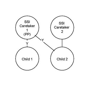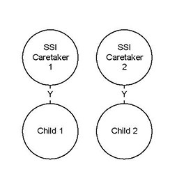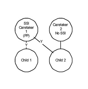 The parents in this household are not married. They have at least one child in common. One of the parents has their own child(ren). Explanation The oldest child in common is the target child. The child in common provides a link for their siblings to be pulled into the SFU. CARES Processing Parents should be coded on ANHR as caring for all of their children. Because Caretaker 1 is the parent for both Child 1 and Child 2, that parent is coded as caring for both children on ANHR. This will produce one AG in CARES. CTS Benefits The CTS supplement will be $250, paid to Caretaker 1. (Child 2 is ineligible because only one of their parents is an SSI recipient.) Buening Implications This case has the potential of becoming a Buening case. If the group fails the CTS eligibility test for financial reasons, the worker must determine whether Child 2 is "needy." If Child 2 is needy, the group should be confirmed as ineligible for CTS. If Child 2 is not needy, the worker must change the request on ACPA to "N" for both Child 2 and SSI Caretaker 2 and retest the group for CTS eligibility. |