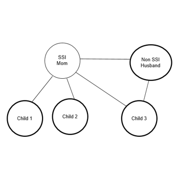 Mom and Dad are married. They have a child in common and a child(ren) of their own. The only child in common is an SSI recipient. Explanation The SSI child breaks the link between Child 1 and Child 3. No relationship exists between Child 1 and Child 3 (they are not full or half siblings) to pull the children into one SFU. CARES Processing Because the parents are married, this scenario can be processed in one case, two AGs. CTS Benefits This case will receive two CTS payments of $250 each. |