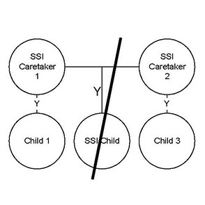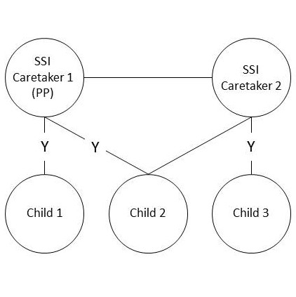The parents in this household are not married. THey have at least one child in common and each has their own child(ren). Explanation The child in common provides a link to their siblings to be pulled into the SFU. CARES Processing Because everyone is pulled into one SFU, this scenario will be processed in one AG. Because Caretaker 1 has no qualifying relationship to care for Child 3, Child 3 cannot be included in their CTS supplemental payment. CTS Benefits A CTS Supplement will be added to each parent's state SSI payment. Caretaker 1 will receive a $400 payment; Caretaker 2 will receive a $250 supplement. |