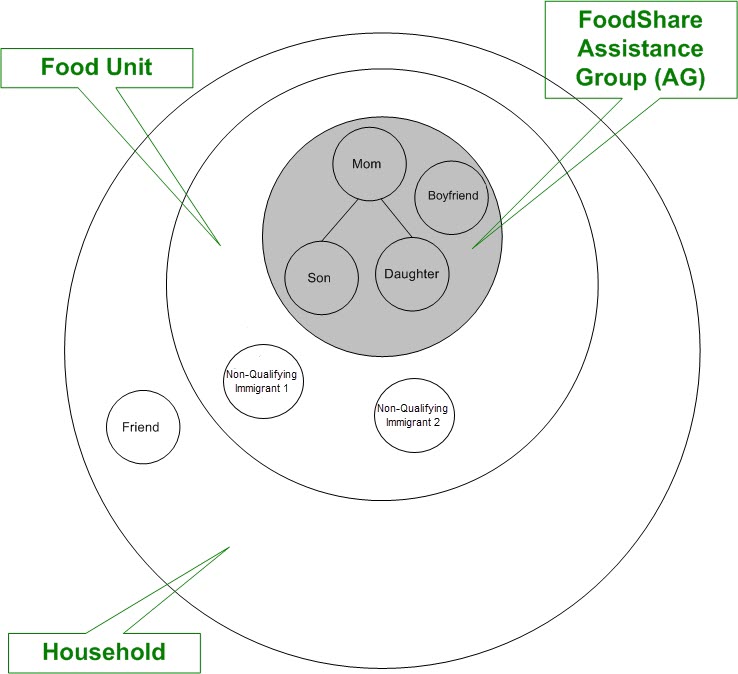 The FoodShare assistance group is formed by persons in the same food unit who pass all the individual non-financial criteria. The FoodShare assistance group are the people who are found eligible for the benefit.
